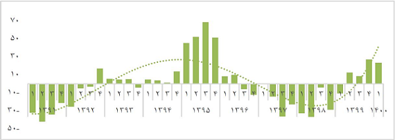 نمودار 2 رشد ارزش افزوده بخش نفت تا بهار 1400 را به صورت فصلی نشان میدهد. همانطور که ملاحظه میشود افت تولید بخش نفت در سالهای 1397 و 1398 قابل توجه بوده است، با توجه به تحریمهای آمریکا و تبعیت بخشی از خریداران نفت ایران از آن، رشد منفی بخش نفت مورد انتظار بوده است.