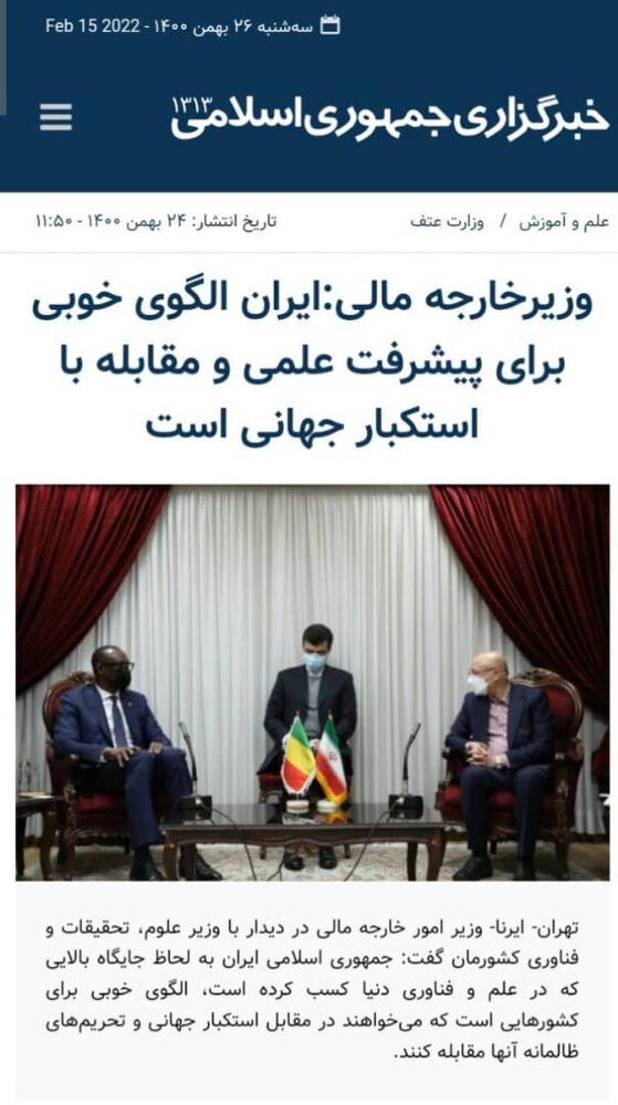 یورونیوز نوشت: عبدالله دیوپ، وزیر امور خارجه مالی، روز دوشنبه اظهاراتی را که خبرگزاری رسمی ایران ایرنا از او نقل قول کرده بود رد کرد و خواهان حذف خبر منتشره شد.به گزارش خبرگزاری فرانسه، ایرنا پیشتر در خبری که بر روی وبسایت رسمی خود منتشر کرد آورده بود که آقای دیوپ در دیدار از تهران و ملاقات با محمدعلی زلفی‌گل، وزیر علوم، ایران را «الگویی برای کشورهایی که می خواهند با استکبار جهانی و تحریم های ظالمانه آن مخالفت کنند» قلمداد کرده بود.