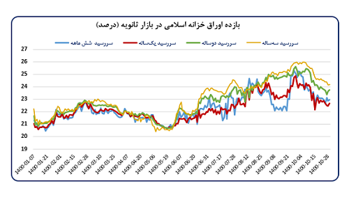 در دی امسال به دلیل کاهش انتظارات تورمی و متعاقب آن کاهش بازده اسمی انتظاری در بازار سایر داراییها، نرخهای بازده اوراق مالی اسلامی دولتی روند نزولی بهخود گرفت؛ به نحوی که در این ماه نرخ بازده اسناد مذکور با سررسیدهای یک، دو و سهساله، بهترتیب با ۰.۳۸، ۰.۴۸ و ۰.۲۰ واحد درصد کاهش نسبت به ماه قبل بهترتیب به ۲۳.۲۸، ۲۴.۴۳ و ۲۵.۰۶ درصد رسید.