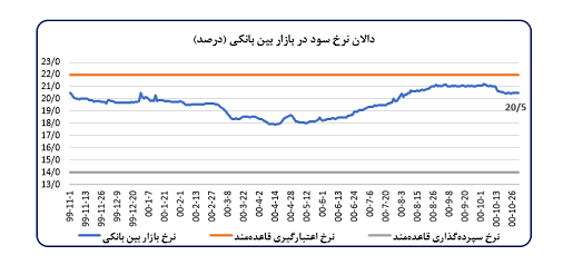 بررسی روند تغییرات نرخ بازار بینبانکی نشان دهنده کاهش این نرخ طی دی در قیاس با ماههای گذشته و تثبیت آن در محدوده ۲۰.۵ درصد بوده است.