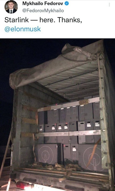 معاون رئیسجمهور اوکراین با انتشار عکس تجهیزات اینترنت ماهوارهای استارلینک متعلق به شرکت ایلان ماسک نوشت: استارلینک اینجاست. ممنون ایلان ماسک.