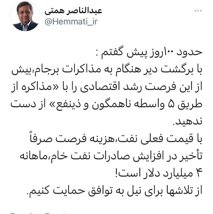 عبدالناصر همتی در توییتی نوشت: حدود ۱۰۰ روز پیش گفتم: با برگشت دیرهنگام به مذاکرات برجام، بیش از این فرصت رشد اقتصادی را با "مذاکره از طریق ۵ واسطه ناهمگون و ذینفع" از دست ندهید.