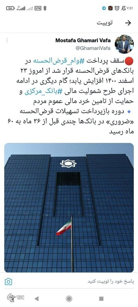 مصطفی قمریوفا، سخنگوی بانک مرکزی با انتشار توئیتی اعلام کرد: «سقف پرداخت وام قرض الحسنه در بانکهای قرض الحسنه قرار شد از امروز ۲۳ اسفند ۱۴۰۰ افزایش یابد؛ گام دیگری در ادامه اجرای طرح شمولیت مالی بانک مرکزی و حمایت از تامین خرد مالی عموم مردم است. دوره بازپرداخت تسهیلات قرض الحسنه " ضروری" در بانکها چندی قبل از ۳۶ ماه به ۶۰ ماه رسید.»