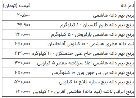 در پی افزایش قیمت برنج در بازار، قیمت برنج نیم دانه که مردم از آن برای پخت برخی از انواع غذاها و دسرها استفاده میکنند نیز افزایش قیمت زیادی داشته است. به طوری که ارزانترین آن کیلویی ۲۰ هزارو ۵۰۰ تومان و گرانترین آن ۵۳ هزار تومان قیمت دارد. همچنین قیمت هر کیلوگرم نیم دانه هاشمی اعلا سرلاشه معطر ۸۶ هزار تومان است.