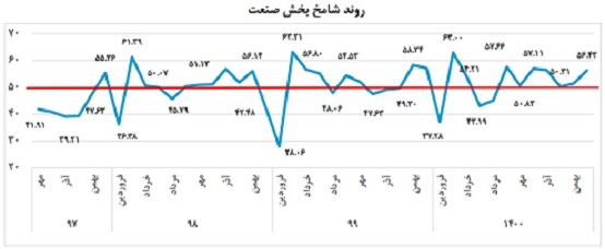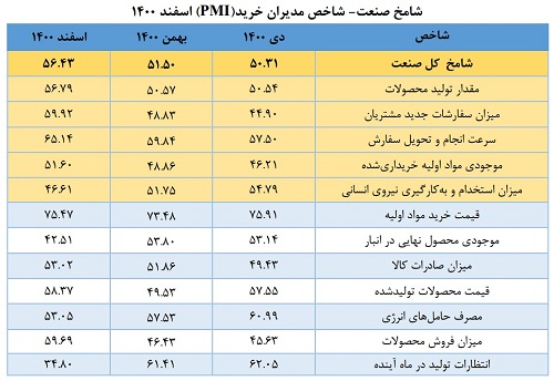 بر اساس دادههای بهدستآمده از بنگاههای بخش صنعت، شاخص مدیران خرید صنعت در اسفندماه عدد ۵۶,۴۳ بهدستآمده است. رشد شاخص بخش صنعت، در مقایسه با اسفند سال ۱۳۹۹ (۵۷.۲۹) اندکی کمتر است. در اسفندماه در میان مؤلفههای اصلی، فقط شاخص میزان استخدام و بهکارگیری نیروی انسانی عدد زیر ۵۰ را به ثبت رسانده است. همچنین صنایع لاستیک و پلاستیک کمترین و چوب، کاغذ و مبلمان بیشترین عدد شاخص کل را به ثبت رساندهاند.