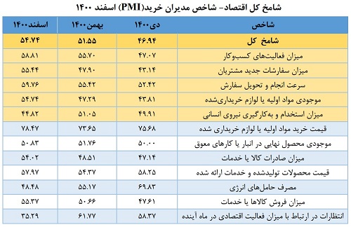 طبق نظرسنجی انجام شده از بنگاههای اقتصادی کشور، شاخص مدیران خرید (تعدیل فصلی نشده) برای کل اقتصاد ایران در اسفند ۵۴,۷۴ بهدستآمده و شاخص کل به بیشترین نرخ ۵ ماهه اخیر از مهرماه رسیده است و عدد شاخص تقریباً مشابه اسفندماه سال گذشته (۵۴.۷۳) است. در این ماه بهغیراز میزان استخدام و بهکارگیری نیروی انسانی سایر مؤلفههای اصلی بالای ۵۰ ثبت شدهاند. در اسفندماه اکثر فعالان اقتصادی در هر سه بخش اقتصادی وضعیت را بهتر از ماه قبل ارزیابی کردهاند.